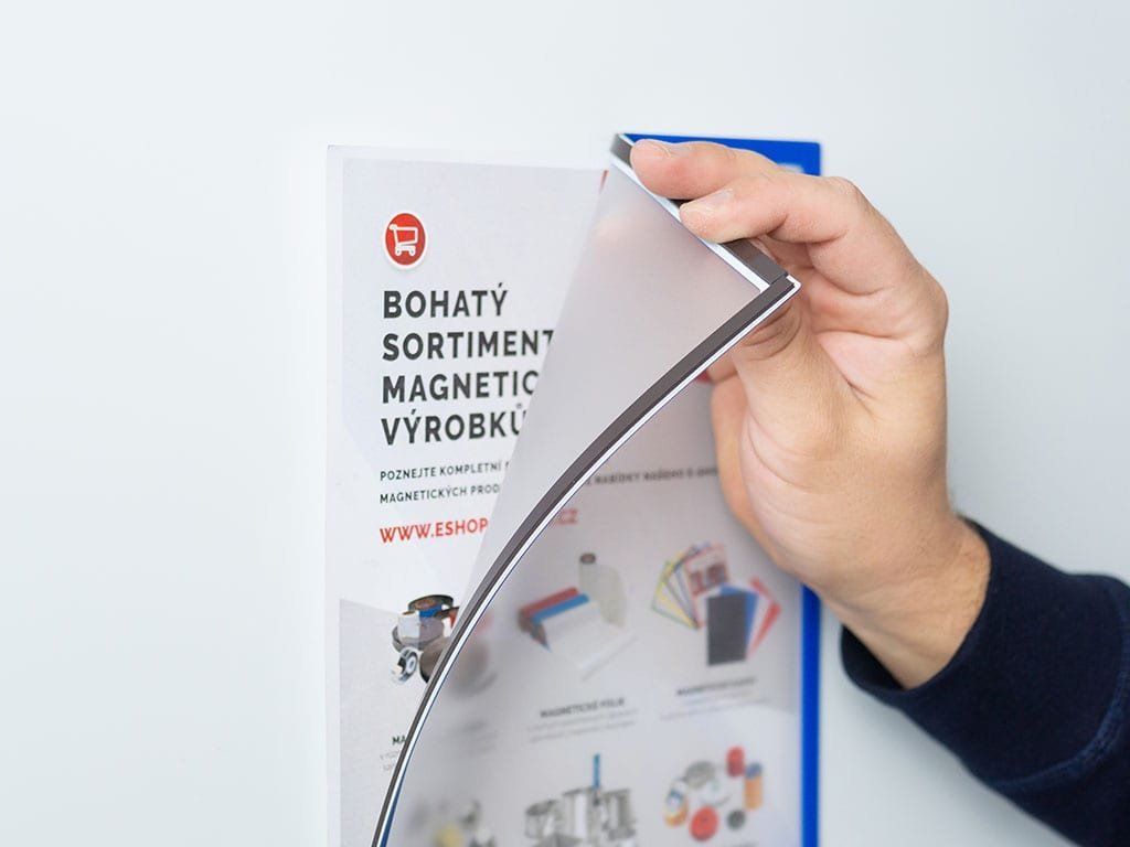 Buzunarul magnetic cu ramă A4 este dotat cu o parte frontală dintr-un film PVC mat transparent, delimitată de o bandă magnetică colorată. Rama magnetică solidă astfel creat permite introducerea ușoară a documentelor prezentate. Partea din spate a ramei este realizată pe toată circumferința dintr-o folie magnetică maro flexibilă cu lățimea de 6 mm. Buzunarul magnetic cu ramă este potrivit pentru afișarea vizuală a mesajelor în combinație cu o "tablă albă" sau altă suprafață metalică. Acesta poate fi fixat atât în poziție orizontală, cât și verticală.